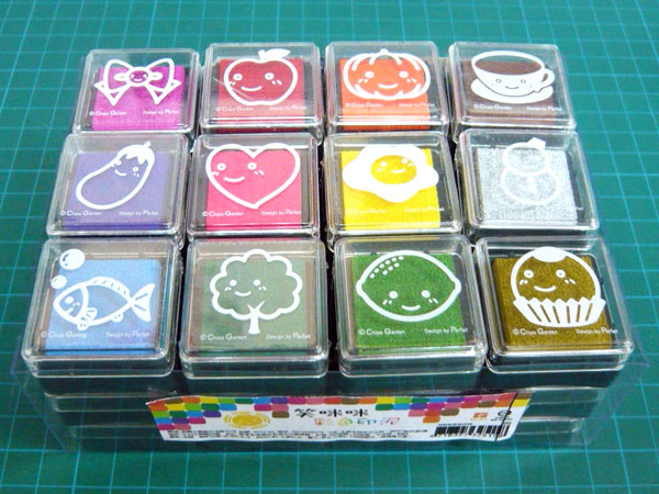 ↑另一樣重點商品,就是這組彩色印台。共12色,每種顏色的圖案都不同喔!這家合作廠商專門做外銷,而我們選用的材料跟美術社進口來給大家做卡片用的印台是相同的,顏色相當飽和漂亮,也不會有那種買來的時候就已經半乾的慘劇。