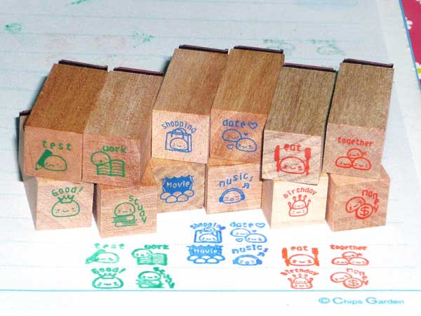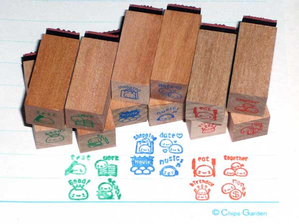 ↑搭配印台,這個月也推出了一組迷你橡皮印章,主角是我們當家饅頭。圖樣尺寸只有7mm,非常適合蓋小本奔或筆記本。共有12種圖樣,背面有三種顏色:綠色是學業組合、藍色是玩樂組合、橘色是生活組合,都是一般日曆小手冊常用到的標記。印章是一顆顆單賣的,一顆才10塊錢。可以依照個人需求挑選。(像我這種不唱歌又不聽演唱會的就不會用到音樂那顆)不過我覺得饅頭生日蛋糕那顆一定要有!!一整年的月曆上寫最多次的就是生日啊!!用蓋章超省事的!而且寫生日卡片也可以用,一舉數得。