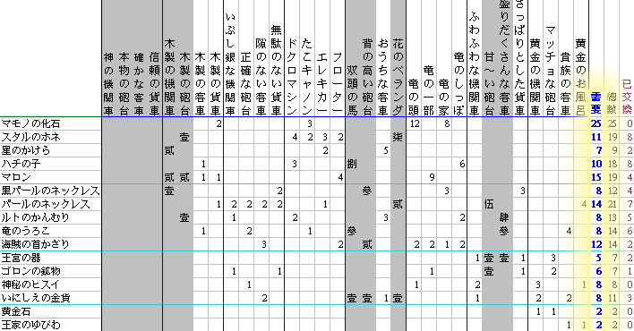 最右邊「需要」欄是全部集滿所需要的寶物數量,把已經到手的項目刪除掉或改顏色,寶物數量也刪除掉或改成不是數字格式,這樣就可以很清楚的看到還需要蒐集幾個了。多出來的可以賣錢再去商店買寶物。
