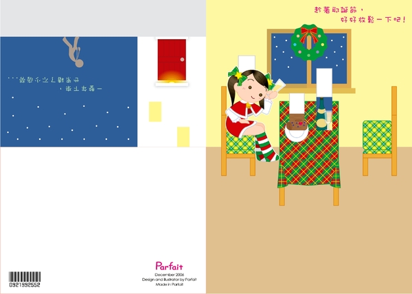卡片本體請使用稍厚的美術用紙,比如水彩紙之類的來列印。這樣比較好折,做好才不會癱軟。印好以後對折,就是一面裡一面外。椅子、桌子、香檳、木柴蛋糕、還有耶誕女孩的部分是立體的,垂直線要切,水平線交界線要折。比較麻煩的是女孩的部分,請沿著她周圍的白線切,注意背部、小腿跟椅子是分開的,但大腿是粘著椅子的,腳底也是粘著地板的。