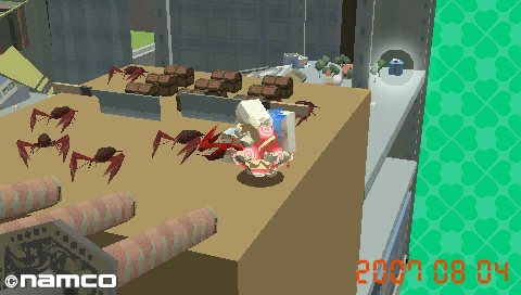 沿著鐵櫃,經過牆角的三把武士刀,滾到瓦稜紙箱上面。接著滾落至另一座鐵櫃上,就可以直衝禮物了。由於禮物所在的鐵櫃與紙箱有斷差,無法回頭,所以請務必在沿路上多利用鯖魚壽司及寶物箱增加體積。