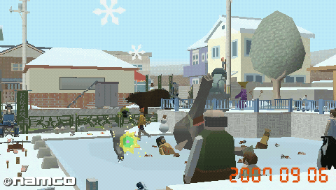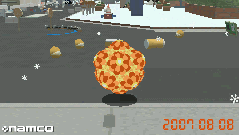 由於物品配置的關係,不建議走跟櫻町同樣的路線。建議開始先把面前的東西黏一黏,一路從西邊(右邊)停著車的斜坡滾下去。把企鵝附近的飯糰、土司黏一黏,到30cm後就可以把郵筒前的相框、鬧鐘、明信片全部黏起來,一口氣增加到40cm以上。然後再往東左轉上坡,把速食餐、橘子、狗食盆收一收,不要繞過池子,直接從下面馬路把保特瓶等物品清乾淨,直接到分段點。